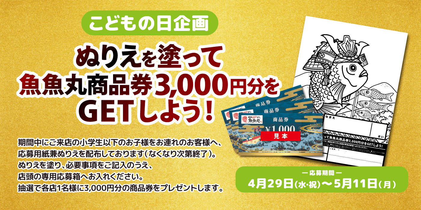 4月29日(水)~5月11日(月)の期間は、こどもの日特別企画として「ぬりえキャンペーン」も同時開催!!心を込めて塗ってくれたお子様の中から、抽選で各店1名様に3,000円分の魚魚丸商品券をプレゼントします!食べて、塗って、GWは家族みんなで魚魚丸を満喫しませんか?