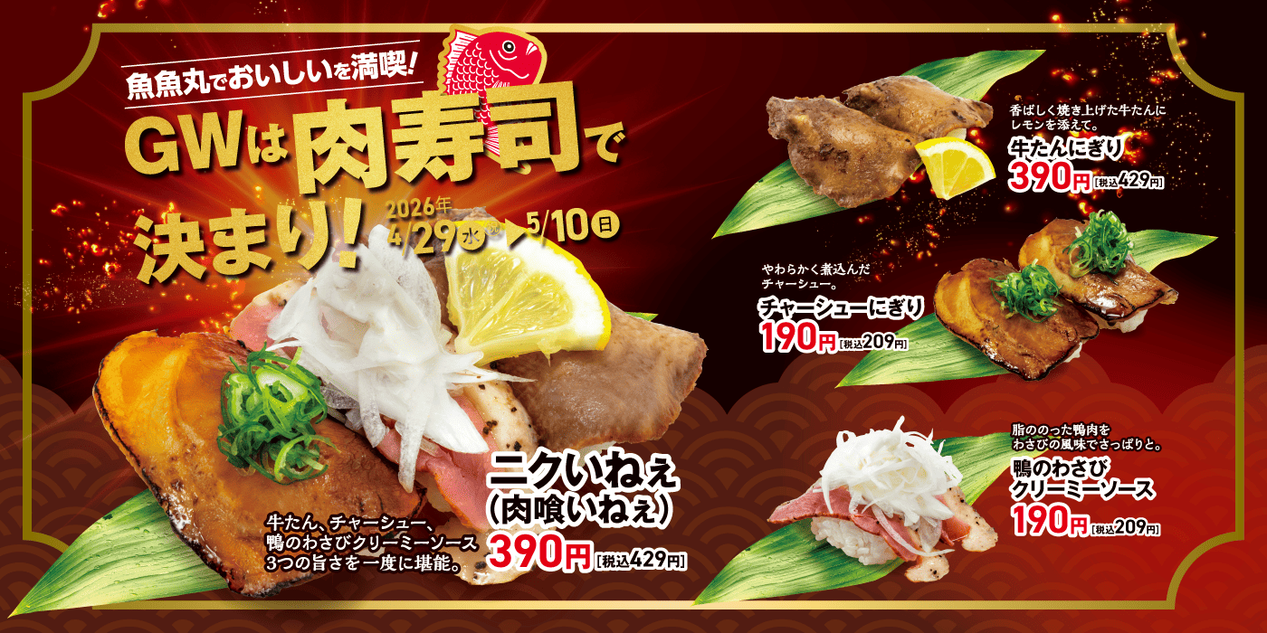 お魚だけじゃないのが魚魚丸!お肉の旨みを最大限に引き出した、驚きの「肉寿司」フェアを4/29~開催します!