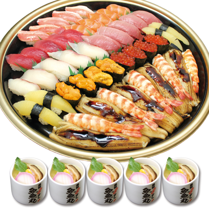 【商品内容】丸ずわいがに・まぐろ・サーモン・白身・中とろ・数の子・バフンウニ・いくら・名物焼穴子・大えび・茶碗蒸し5個