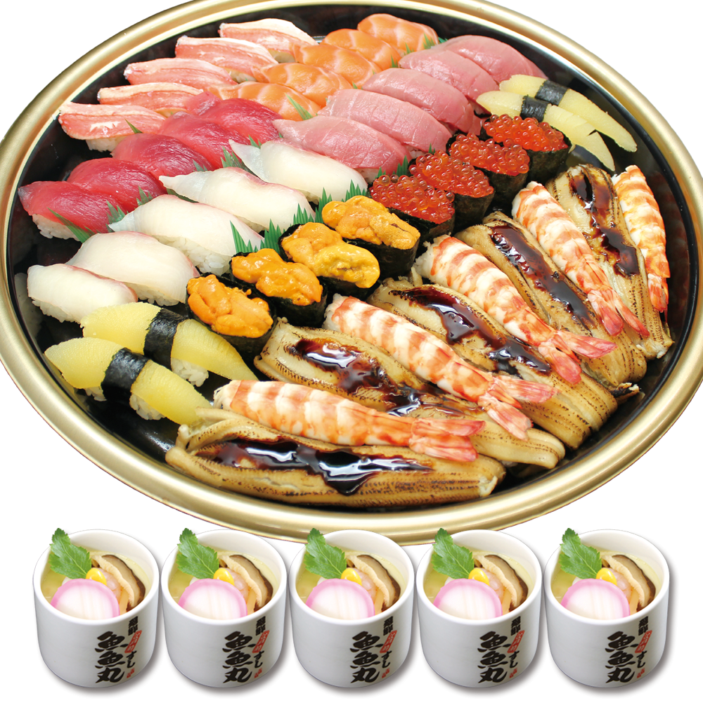 【商品内容】丸ずわいがに・まぐろ・サーモン・白身・中とろ・数の子・バフンウニ・いくら・名物焼穴子・大えび・茶碗蒸し5個